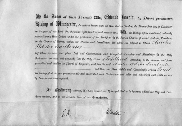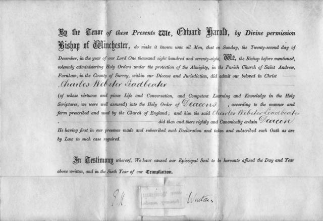 Charles Webster Leadbeater wurde in England, Stockport, in der englischen Grafschaft Cheshire geboren. Sein genauer Geburtstag kann nicht eindeutig festgestellt werden, weil in seiner Geburtsurkunde der 16. Februar 1854 als Geburtstag steht, in seinem Reisepass jedoch der 17. Februar 1847 als Geburtstag angegeben ist. In seiner Jugend hat er in kirchlichen Positionen gearbeitet, bis er 1878 zum Diakon der Kirche von England ernannt und ein Jahr später dort zum Priester geweiht wurde. In der Pfarrei Bramshott in Hampshire diente er als Vikar seines Onkels, des Reverents William Wolfe Gapes, der nicht nur ein wohlhabender Rektor, sondern auch ein angesehener klassischer Gelehrter war. Schon damals arbeitete er mit jungen Menschen, mit denen er viele soziale wie auch spirituelle Aktivitäten unternahm, und gründete die Jugendgruppe einer kirchlichen Abstinenzgesellschaft. |