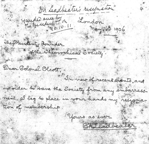 1906 traten jedoch erstmal massive Probleme auf. Man warf ihm vor, Jugendlichen unmoralischer Weise Masturbation beigebracht zu haben, was damals ein großer Skandal war, und forderte seinen Ausschluss aus der Gesellschaft. Leadbeater gab zu, dass er dies Jugendlichen in vier Fällen tatsächlich gelehrt hat, weil er hellsichtig den Schaden gesehen hat, dem sie durch den Druck ihrer erwachenden Sexualität ausgesetzt waren, und verhindern wollte, dass sie zu Prostituierten gehen würden. Aus seiner Sicht hatte er nichts falsch gemacht, dennoch verließ Leadbeater freiwillig die Theosophischen Gesellschaft, um deren Ruf zu schützen.