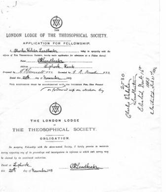 In 1883, he read the book The Occult World by Alfred Percy Sinnett which was a revelation to him. This impressive and readable book opened up new horizons for him and prompted him to contact the Theosophical Society in London, where he was accepted as a member on November 20, 1883. On February 20, 1884, he was then accepted into the London Lodge of the Theosophical Society.